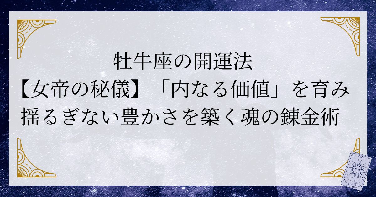 開運の鍵は、タロットの「女帝(The Empress)」のカードに象徴されます。これは、物質的な豊かさと、すべてを包み込む愛、そして創造性を意味します。真の豊かさは、外側の所有物だけでなく、「内なる満足」から生まれることを理解し、それを育むことが牡牛座の開運法です。